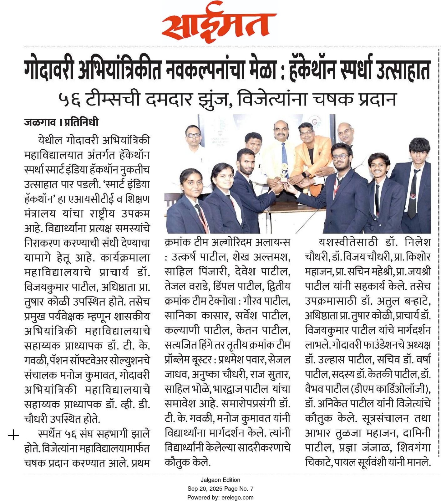 गोदावरी अभियांत्रिकीत नवकल्पनांचा मेळा हॅकेथॉन स्पर्धा उत्साहात