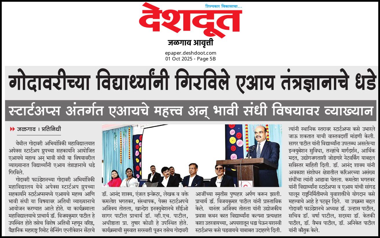 गोदावरीच्या विद्यार्थ्यांनी गिरविले एआय तंत्रज्ञानाचे धडे स्टार्टअप्स अंतर्गत एआयचे महत्त्व अन् भावी संधी विषयावर व्याख्यान