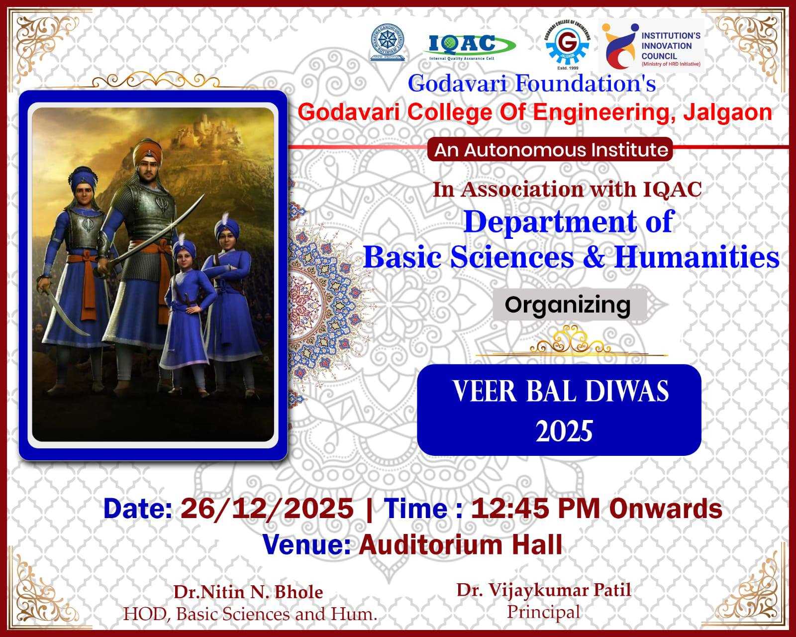 GF's Godavari College of Engineering celebrated Veer Bal Diwas on 26th December with great enthusiasm and patriotic spirit. The program was organized by the Department of Basic Sciences and Humanities under the guidance of Dr. Nitin Bhole, Head of the Department, and was successfully conducted under the leadership of Principal Dr. Vijaykumar Patil.