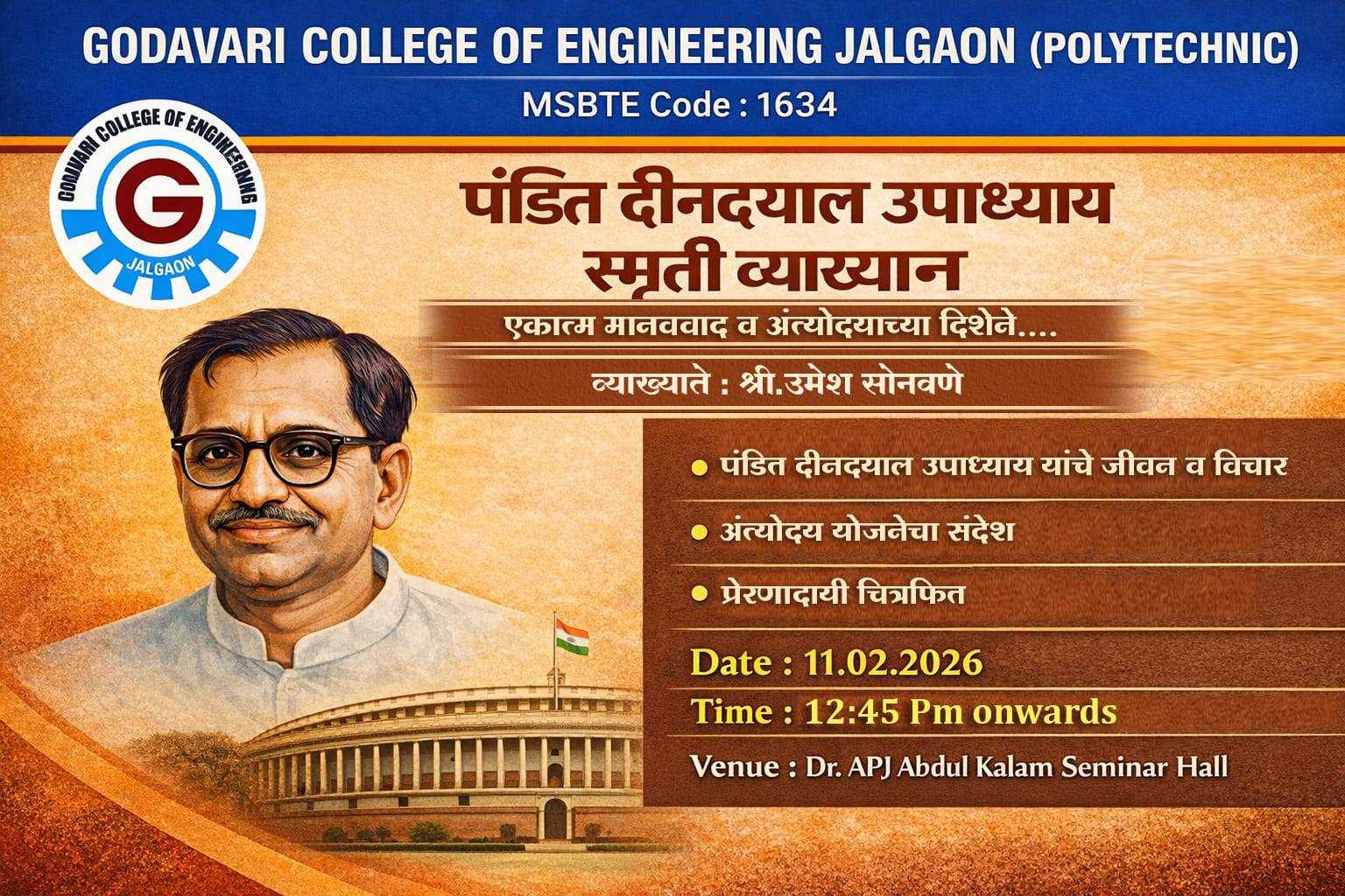 Godavari College of Engineering and Polytechnic (MSBTE Code 1634), Jalgaon organized a special lecture in memory of Pandit Deendayal Upadhyay. On 11th February 2016 at 12:45 PM Dr. A. P. J. The program was held in Abdul Kalam Seminar Hall in a very enthusiastic atmosphere.
