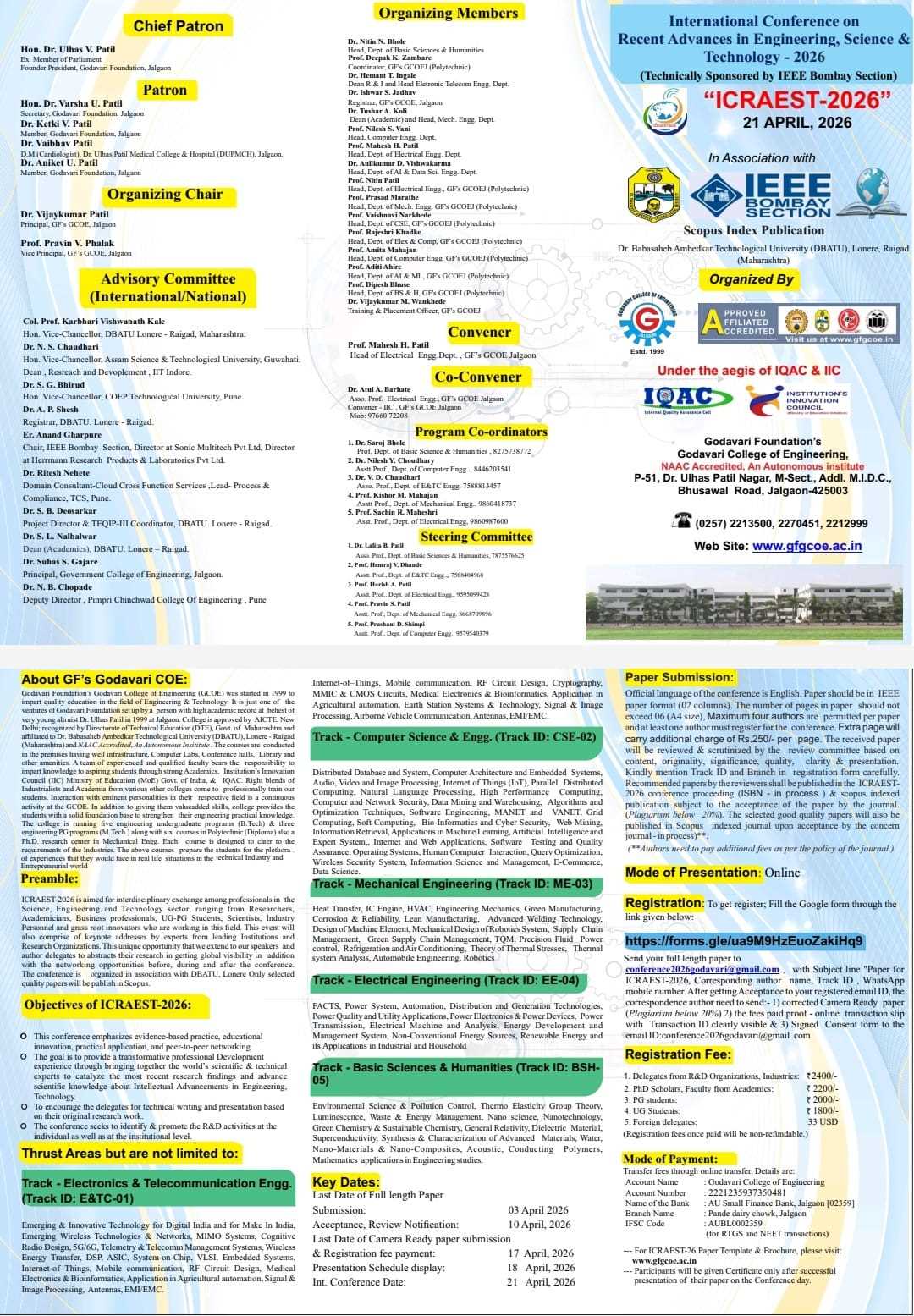 Greetings..!!! from GF's Godavari College Engineering, Jalgaon. (A Tradition of Excellence since 1999, NAAC Accredited, an autonomous institute affiliated to Dr. BATU Lonere-Raigad, approved by AICTE New Delhi, recognized by DTE Govt. of Maharashtra), is organizing an International Conference on Recent Advances in Engineering, Science & Technology (ICRAEST-2026) on 21 April, 2026. This esteemed event is being organized in association with Dr. Babasaheb Ambedkar Technological University (DBATU), Lonere - Raigad. The ICRAEST-2026, likes to invite you and provide a valuable platform to present your unpublished research contributions in the thrust areas in Engineering, Science & Technology including interdisciplinary in nature. Recommended papers by the reviewers shall be published in the ICRAEST-2026 conference proceeding (ISBN– in process). The selected good quality papers will also be published in Scopus. (**Authors need to pay additional fees as per the policy of the publication.)