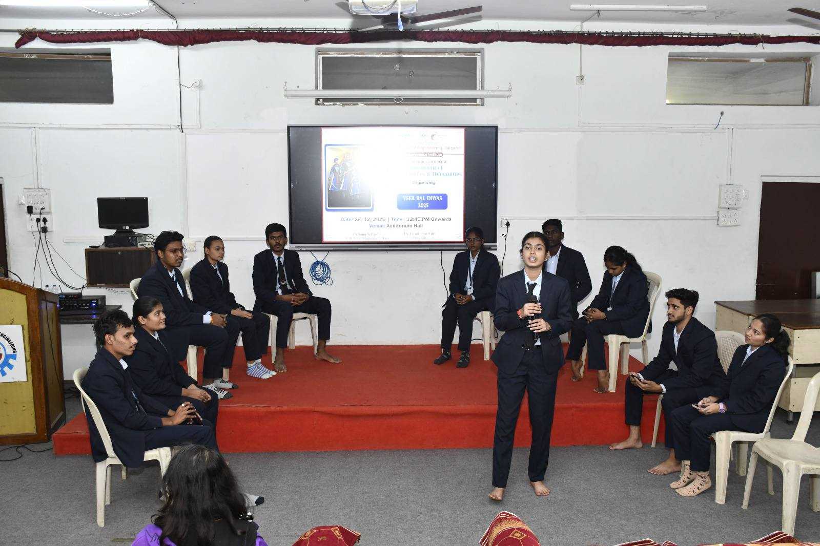 The entire program was efficiently anchored by student Mohit Chaudhari, who kept the audience engaged throughout the event. The judging for the program was carried out by Prof. Sagar Patil, Prof. Pravin Sonawane, Prof. Samyekratna Kamble, and Prof. Pooja Wankhede. Overall, the celebration of Veer Bal Diwas was inspiring, informative, and highly successful, leaving a lasting impact on the students.